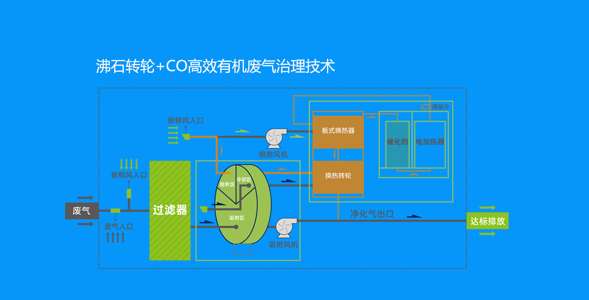 大風(fēng)量、低濃度的有機(jī)廢氣的高效治理技術(shù),適用于間歇式運(yùn)行,降低設(shè)備投資及運(yùn)維能耗。